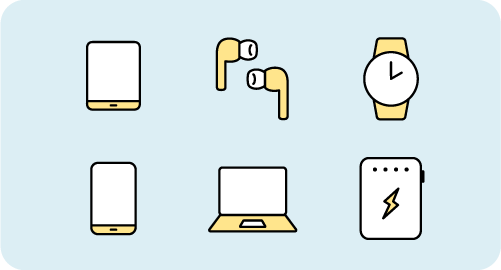 モバイル保険は、日本国内で販売されたメーカー純正の無線通信機器が補償対象で、スマホやタブレット、ワイヤレスイヤホン、ノートパソコンなど、Wi-FiやBluetoothにつながる機器全般に利用できます。